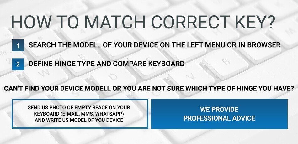 Your keyboard: Acer (Aspire, Predator), Apple (MacBook), Asus, Dell (Vostro, XPS, Latitude), Lenovo (Legion, old IBM), Gateway, HP, Medion, MSI (Raider), Samsung, Sony (Vaio), Toshiba (Tecra, Satellite), Logitech, Clevo, Fujitsu, Microsoft, Packard Bell, Panasonic, Razer, or from another manufacturer has been damaged? You're not sure which key will match your laptop? Are you wondering if the retainer clip is the same as in your device? You don’t know how to dismantle the damaged key and hinge? You ordered a spare key but you have doubts about how to install it? Are you worried about installing replacement keys yourself? Do you want to replace a broken key, but you can't find the model of your device in our store? Contact us - our qualified and experienced consultants will help you select the right products. Our online store is available in 14 languages. We provide advice free of charge so that you can be sure you have chosen the correct keyboard or hinge. You can contact us using the form in the CONTACT section, by calling us, SMS/MMS, WhatsApp, GaduGadu, Skype or our online store's Chat, as well as on our Facebook fanpage. Please let us know which device model you have (for example, the Lenovo ThinkPad T420 laptop) and inlcude a photo of the section of your keyboard which is missing a key. This will help us select the necessary replacement keys.